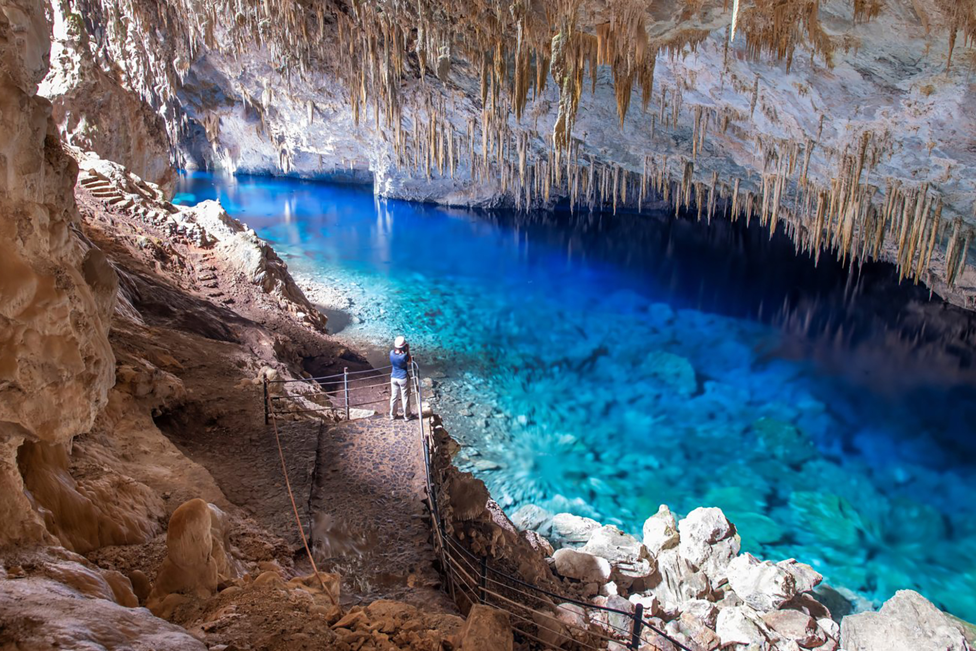 Outro ponto emblemático da região é a Gruta do Lago Azul. Dentro da caverna, um lago de coloração intensamente azul cria um cenário impressionante, resultado da incidência da luz solar sobre minerais presentes na água.