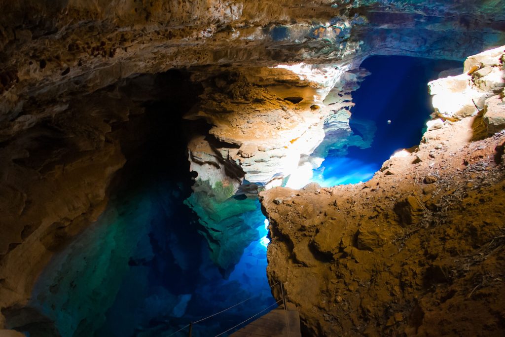A Chapada também abriga formações geológicas impressionantes. A Gruta da Lapa Doce e a Gruta da Pratinha são exemplos de cavernas com enormes salões subterrâneos e lagos de águas transparentes, onde a luz cria efeitos visuais únicos.