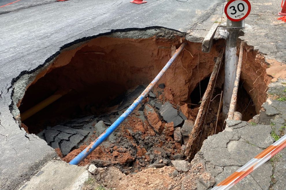 Vazamento foi contido, mas ainda não há prazo para reparo do buraco de 3 metros de profundidade na rua Agostinho Navarro, no Jardim Conceição
